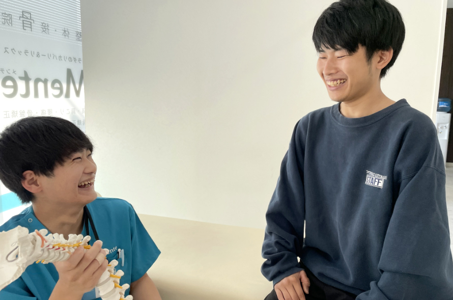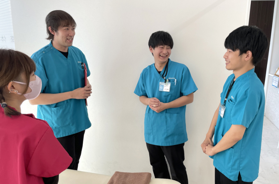Mente接骨院は元気で明るくホスピタリティtoスマイルを心がけ自分が抱えている質問や悩みを相談しやすい職場です。 私自身、学生時代は先生に質問や悩みを打ち明けるのが苦手でしたが、先輩方が質問や悩みに対し真摯に向き合い一緒に考えてくれるため相談しやすくとても働きやすいです。 皆さんとMente接骨院で一緒に働けるときを楽しみにしています。